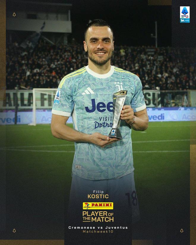 官方消息,科斯蒂奇当选克雷莫内塞对阵尤文图斯一役全场最佳。